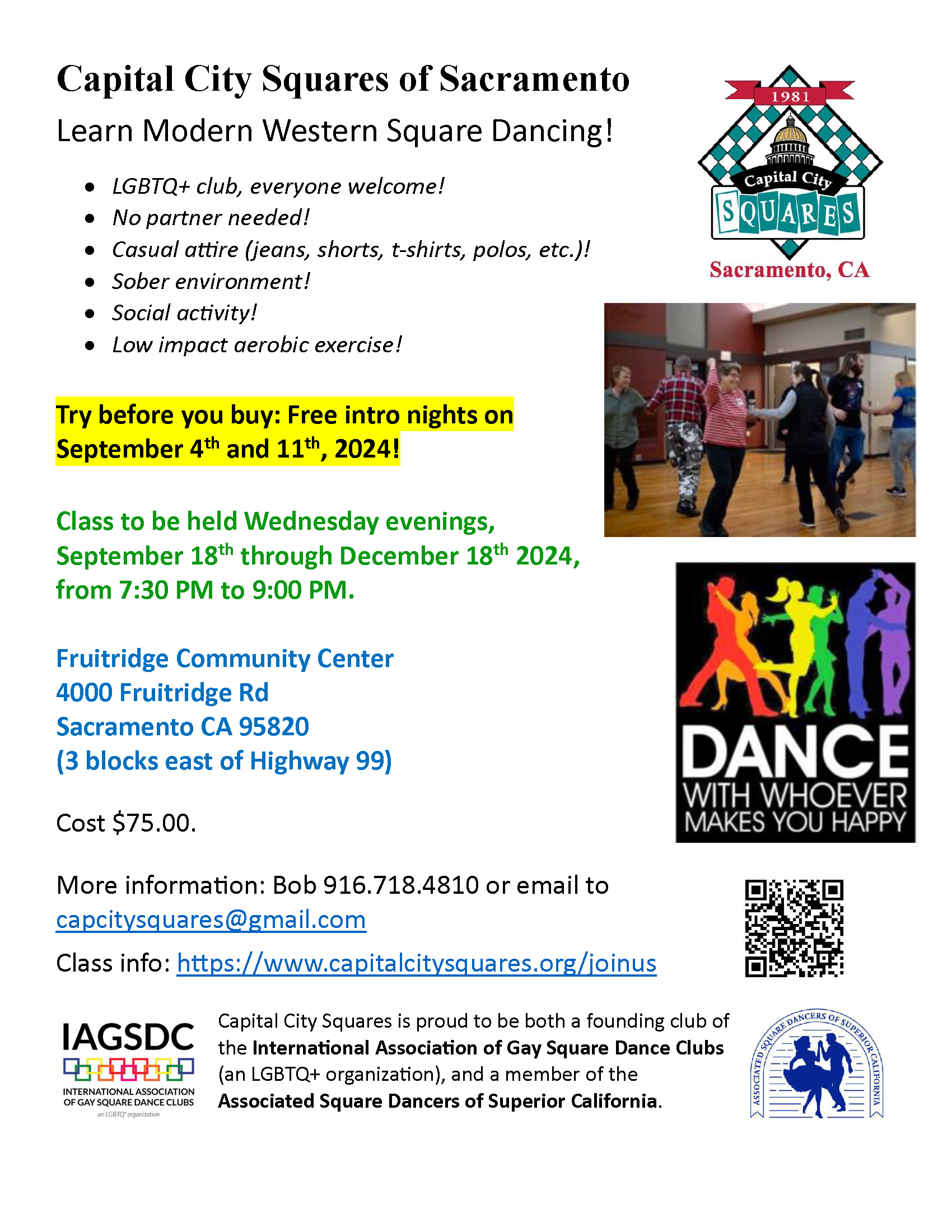 We’re offering a free “taste of square dancing” for two nights at Fruitridge Community & Aquatic Center (4000 Fruitridge Rd, Sacramento, CA 95820) on Wednesday, September 4, 2024 and September 11, 2024, both nights from 7:30 PM to 9:00 PM